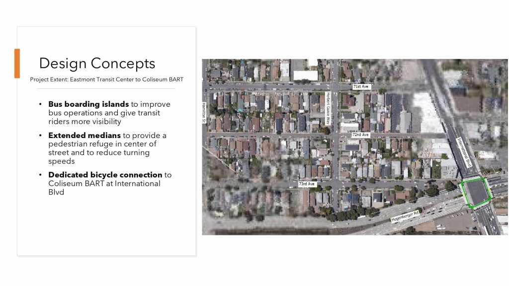 The 73rd Ave Active Routes to Transit project will connect three transit hubs by upgrading existing Class II bike lanes to Class II Buffered bike lanes. This will provide more separation from motor vehicles. This project will also install two concrete protected intersections at International Blvd and Bancroft to provide spaces for bicyclist and pedestrians to wait and shorten their crossing distance. In addition, there will be a new direct connection to Coliseum BART by linking the bikes lanes to a Neighborhood Bike route south of International Blvd.