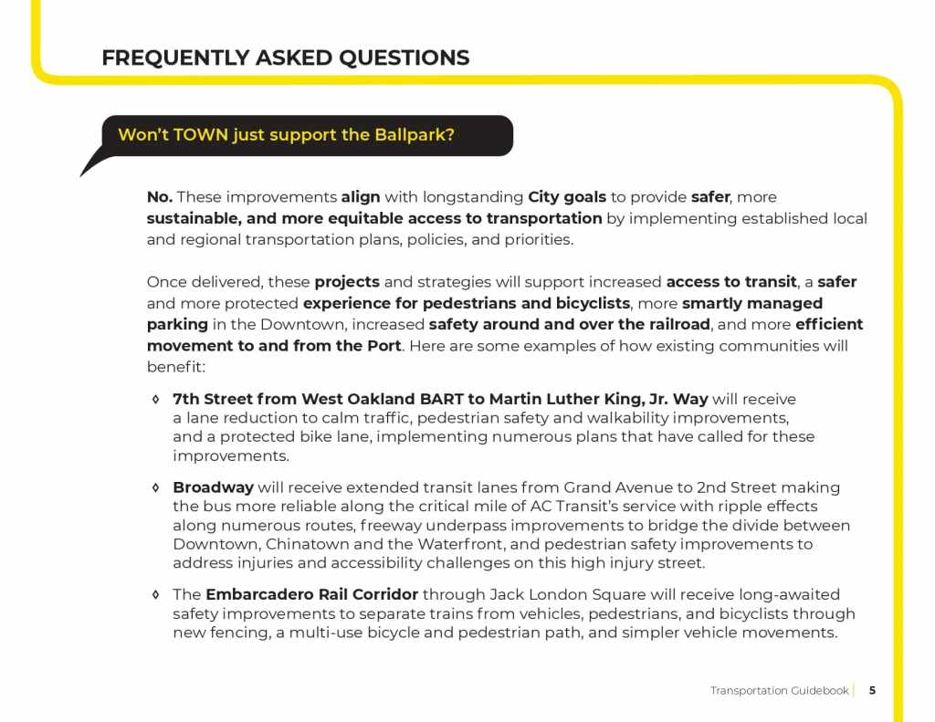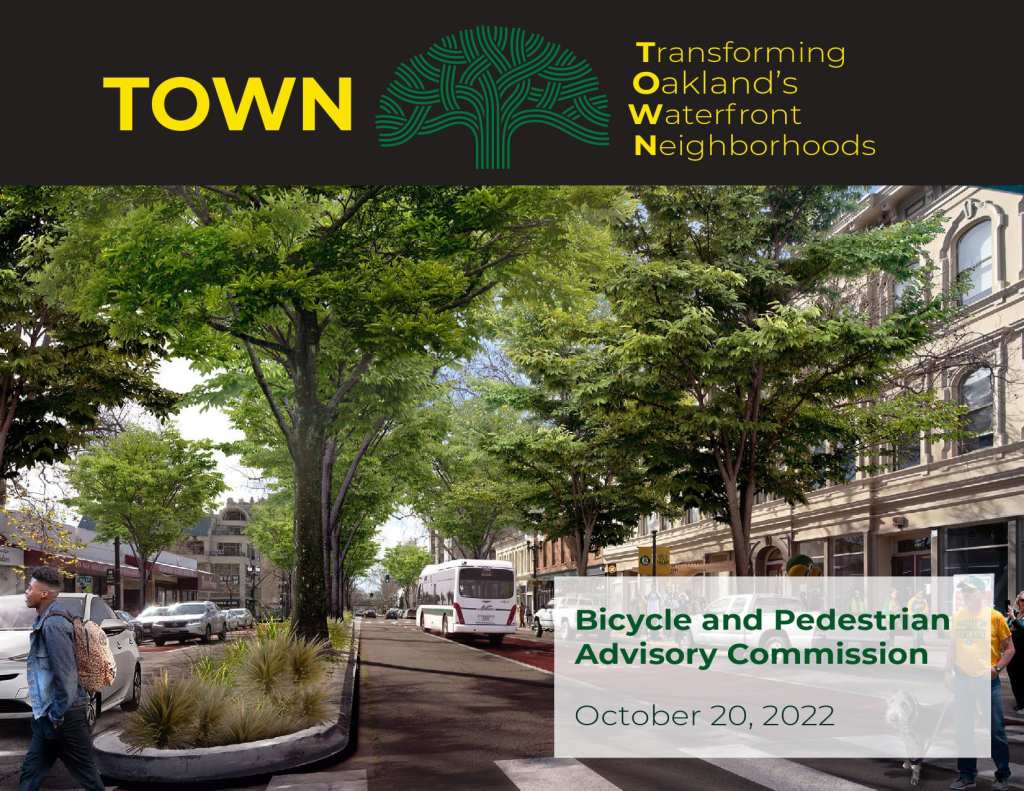 At the October 20, 2022 BPAC meeting, OakDOT Senior Transportation Planner, Audrey Harris, provided an overview of the TOWN projects, a suite of infrastructure improvements that will provide safer, more sustainable and more equitable access between Downtown, Chinatown, and West Oakland and the waterfront while protecting and enhancing goods movement in and out of the nearby Port of Oakland. The TOWN projects have also been designed to facilitate access to and from the proposed Waterfront Ballpark District at Howard Terminal which if approved, would deliver an urban infill project that proposes to build a new ballpark, up to 3,000 new housing units, 1.7 million square feet of commercial space, a 400-room hotel, a 3,500-seat performance venue, and 18 acres of open space, including an extension to the Bay Trail.