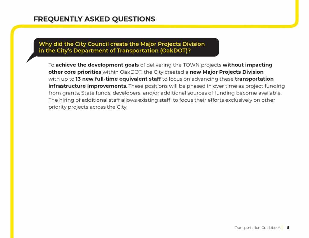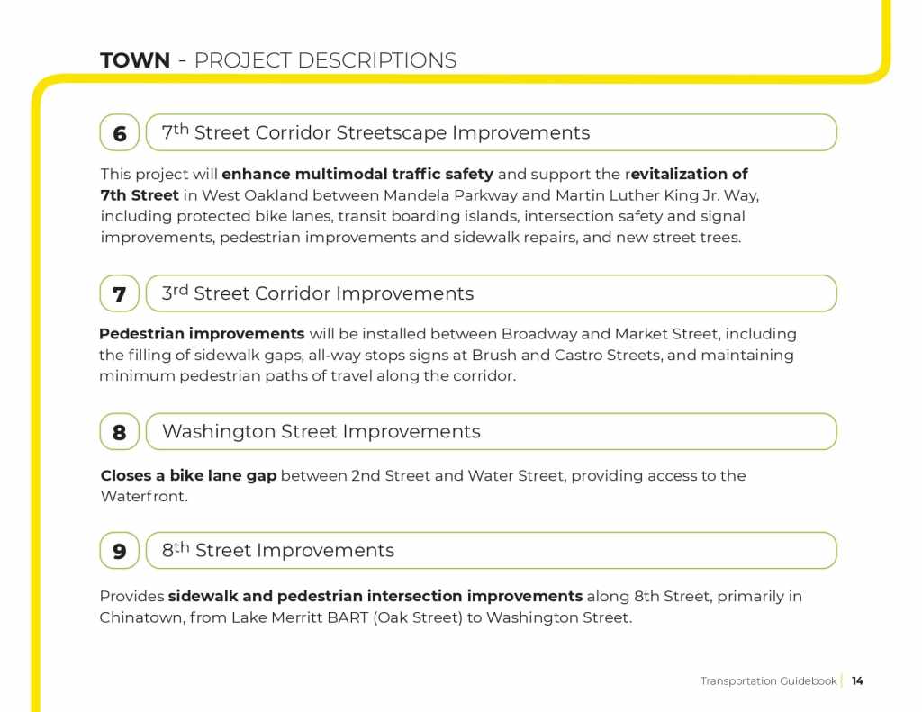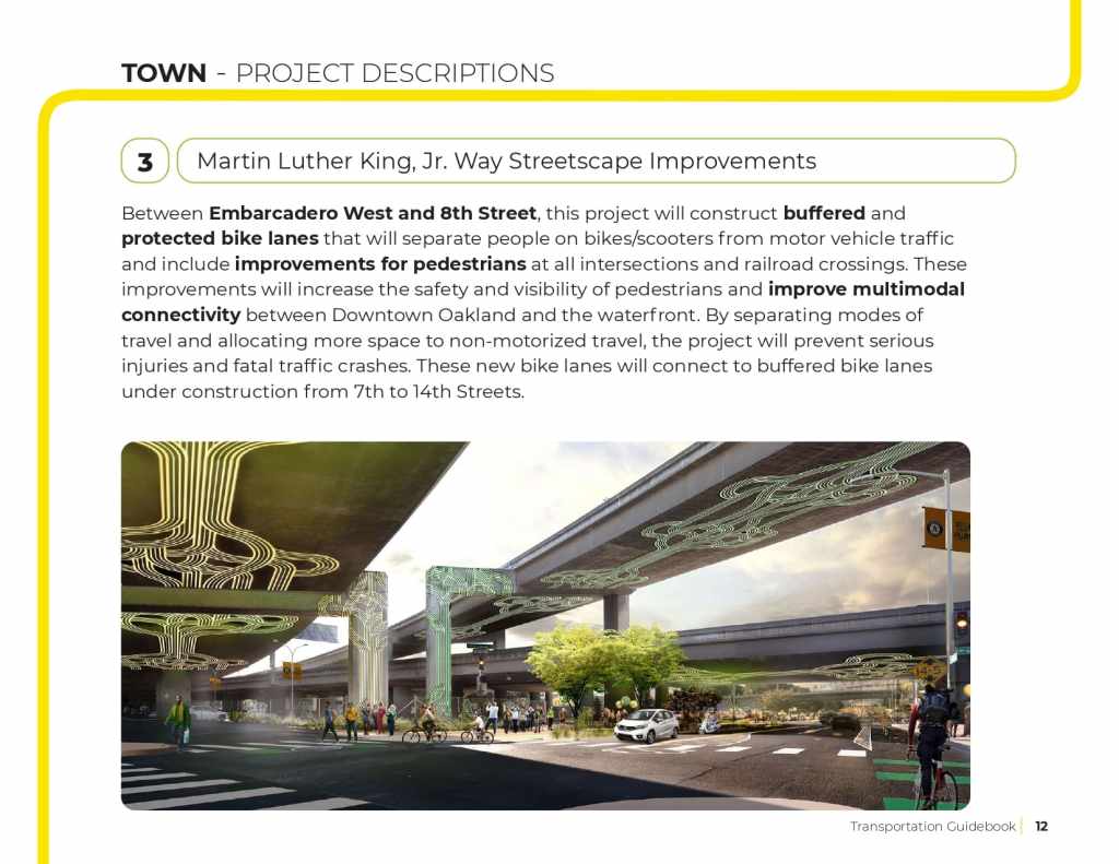 These projects implement longstanding transportation plans, policies and priorities for the City of Oakland, and are estimated to cost approximately $500 million. Over half of those funds have already been secured from State, regional and Federal sources, and fundraising efforts are ongoing to secure external grants to provide the last dollars needed to implement these transformative projects.