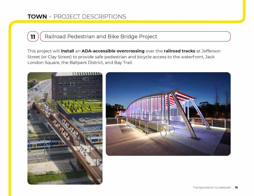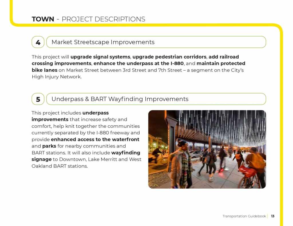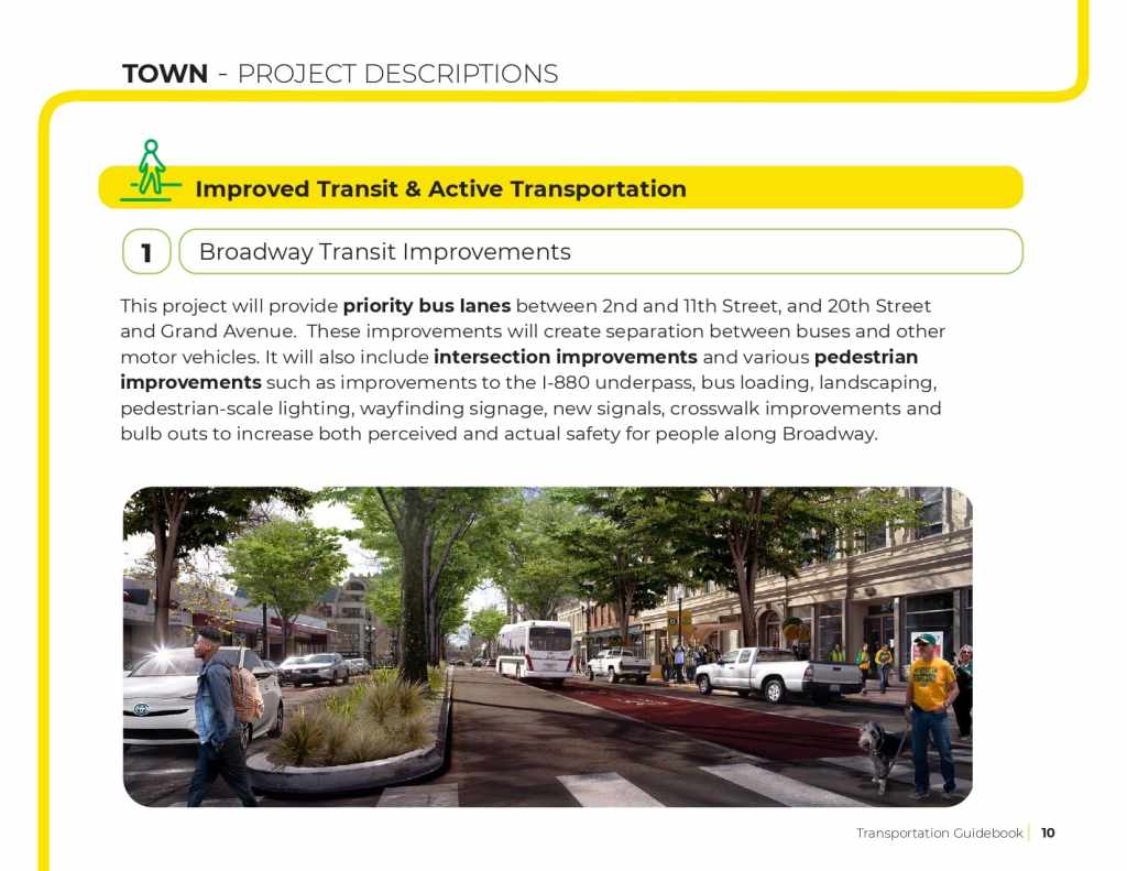 1.4 miles of new transit-only lanes and 10 miles of new sidewalks, bike lanes and trails connecting the greater downtown, Chinatown and West Oakland to the waterfront to encourage walking, biking, and transit.