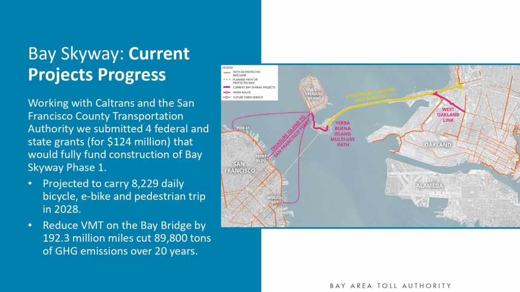 Working with Caltrans and the San Francisco County Transportation Authority we submitted 4 federal and state grants (for $124 million) that would fully fund construction of Bay Skyway Phase 1.