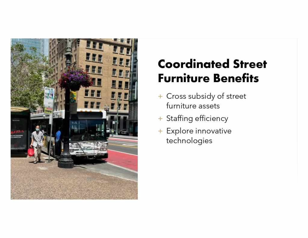 At the February 16, 2023 BPAC Meeting, Michael Randolph, OakDOT Transportation Planner II, and Kerby Olsen, Transportation Planner III, presented exciting news regarding the City’s street furniture. The City’s contract with Clear Channel Outdoor (CCO) to maintain and advertise on Oakland bus shelters will end this April. Staff are developing a request for proposals (RFP) for a long-term Coordinated Street Furniture Program to manage bus shelters, benches, trash bins, public toilets, etc.and other street furniture. Staff anticipates that the RFP will be released in Spring. Additionally, Council instructed staff to enter into a franchise agreement with IKE Smart City, a purveyor of digital informational kiosks.