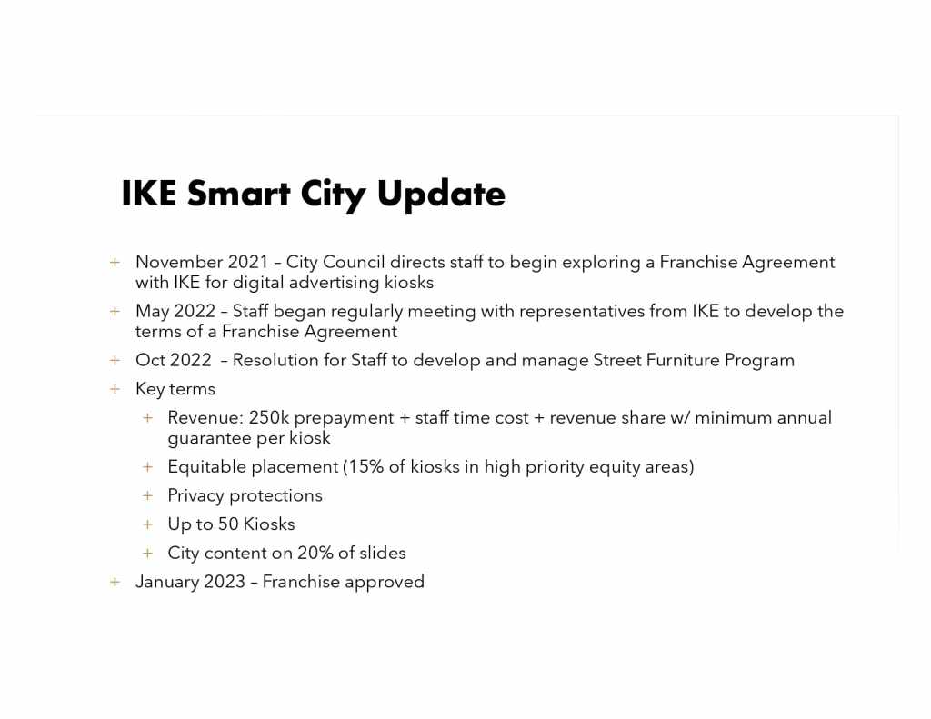 - November 2021 – City Council directs staff to begin exploring a Franchise Agreement with IKE for digital advertising kiosks