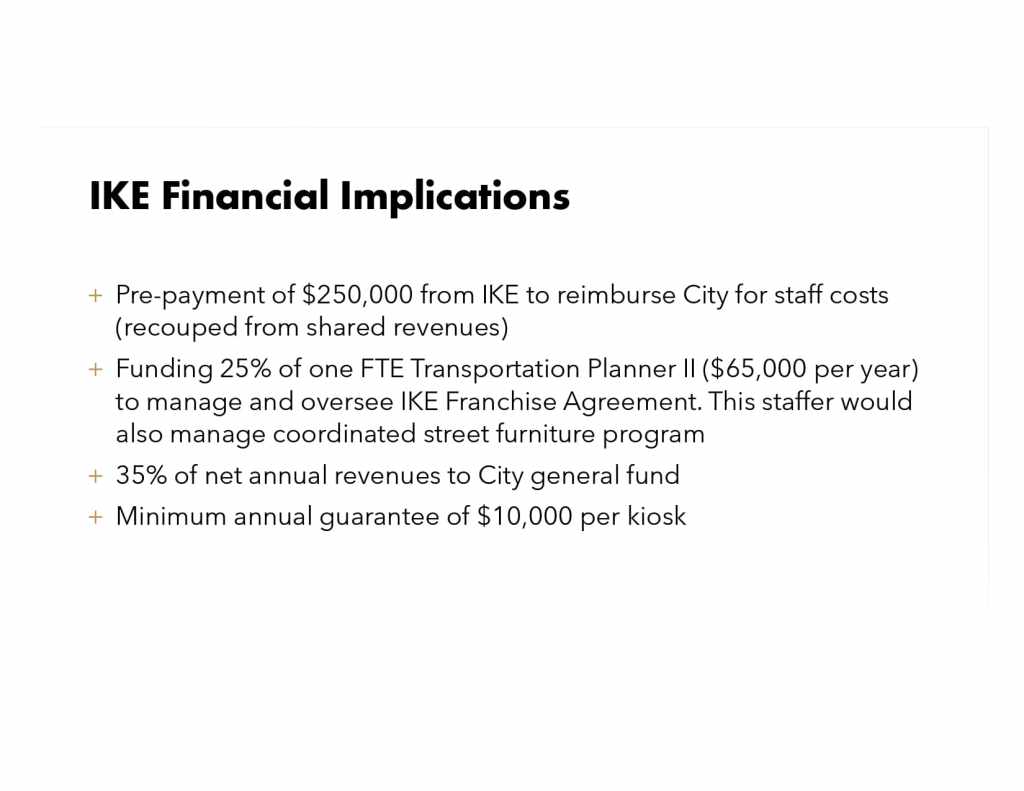 - Funding 25% of one FTE Transportation Planner II ($65,000 per year) to manage and oversee IKE Franchise Agreement. This staffer would also manage coordinated street furniture program.