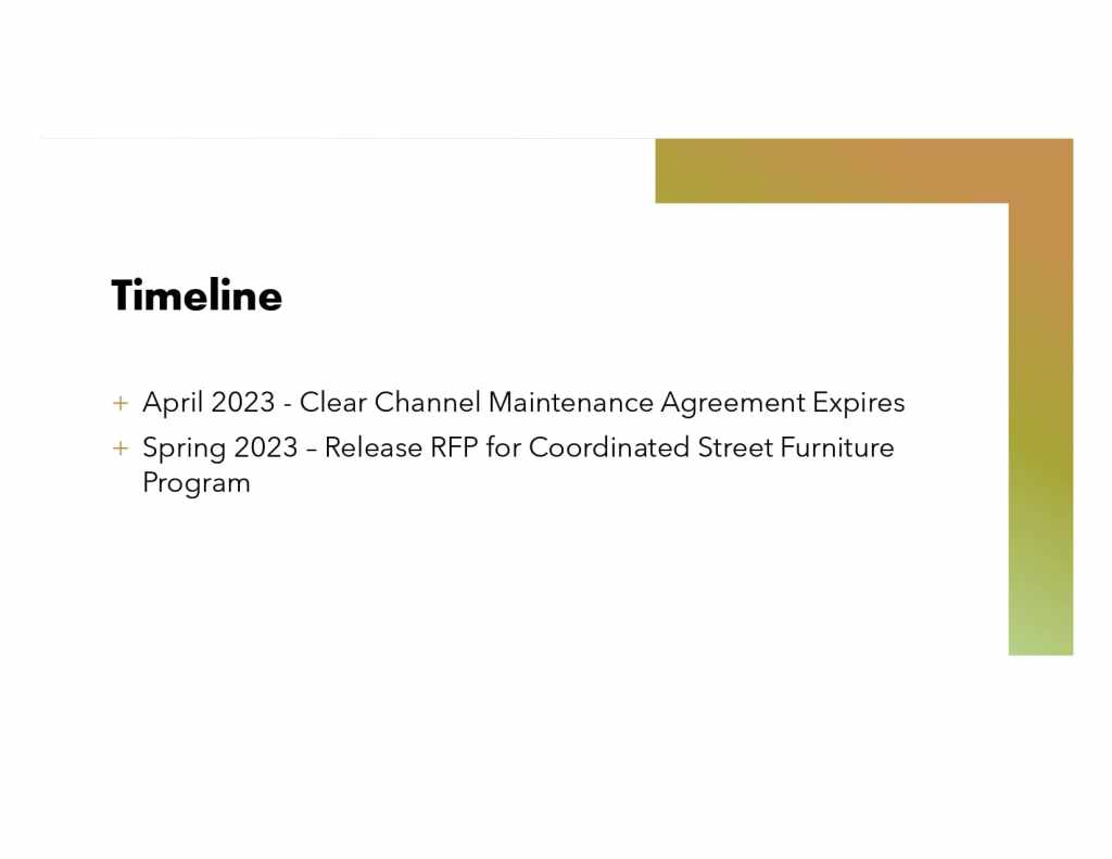 - Oct 2022 – Resolution for Staff to develop and manage Street Furniture Program