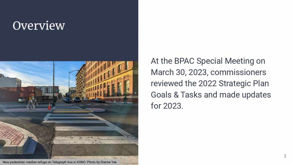 At the April 20, 2023 BPAC meeting, BPAC Chair Dianne Yee presented the BPAC 2023 Strategic Plan for adoption, which the Commission revised from the 2022 Strategic Plan at the March 30, 2023 Special Meeting. The Commission also continued discussion on the status of Committee meetings—whether the Infrastructure and Legislative Committees will begin to meet in-person.