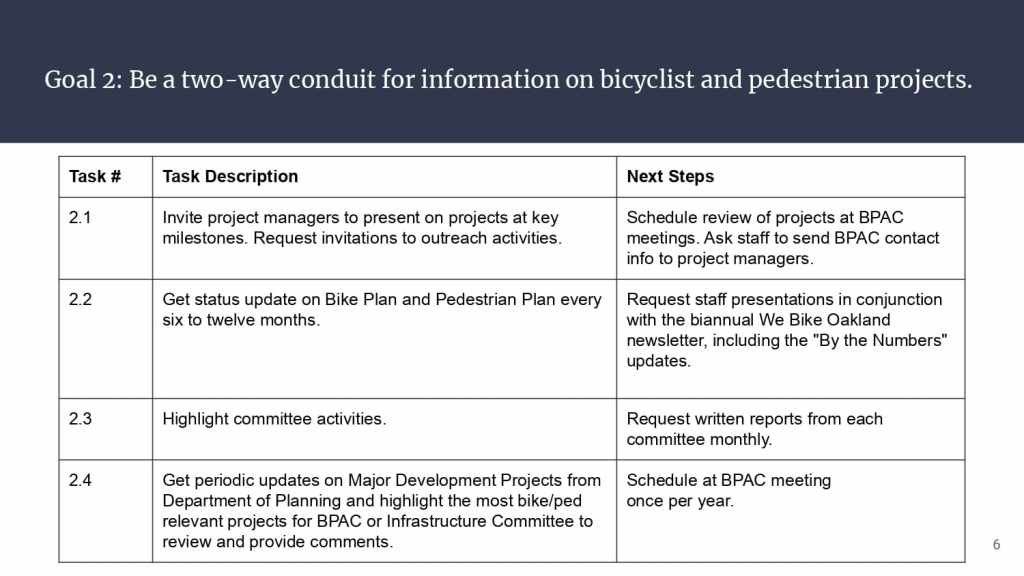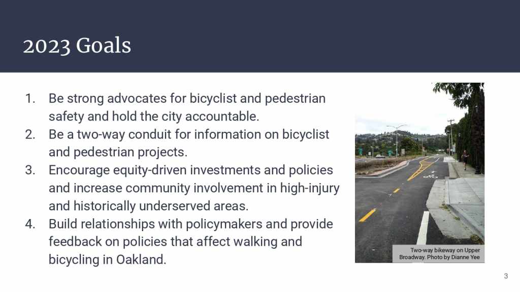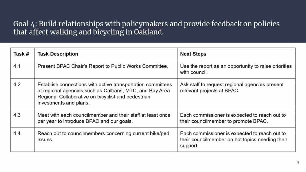 - Build relationships with policymakers and provide feedback on policies that affect walking and bicycling in Oakland.