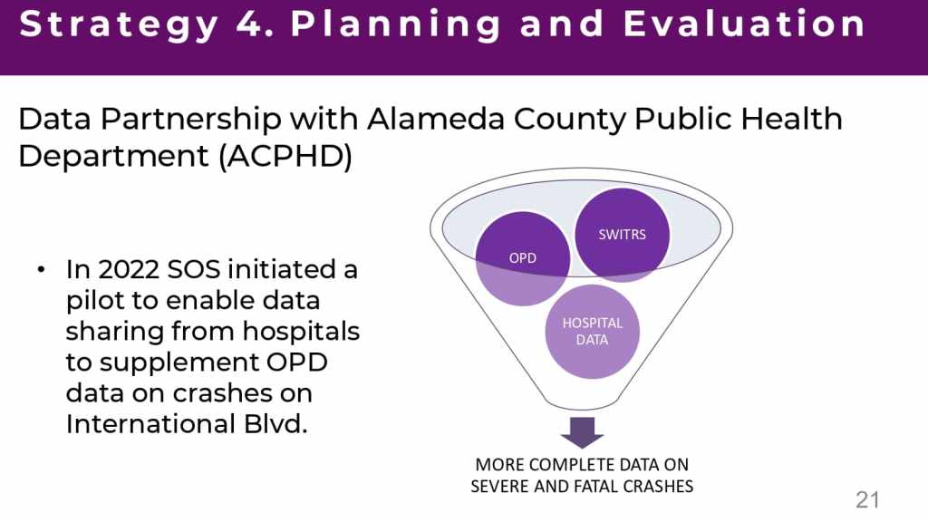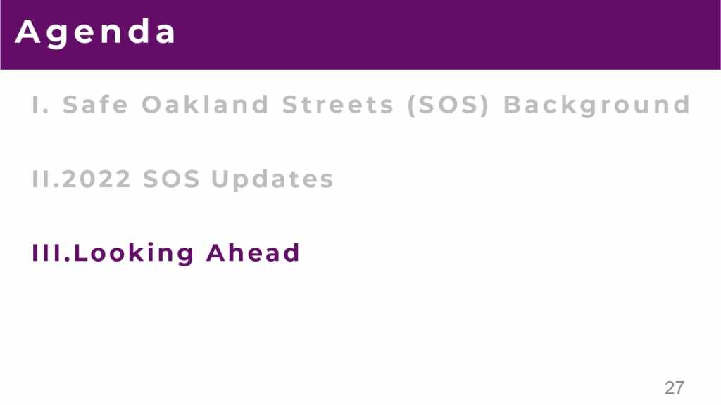 At the May 25, 2023 BPAC meeting, OakDOT Policy & Intergovernmental Affairs Senior Advisor, Tony Dang, provided the second annual update of the SOS initiative. The SOS Initiative was launched in 2021 with the primary goal of preventing severe and fatal crashes and related disparities impacting Black Indigenous and People of Color (BIPOC) communities, persons with disabilities, seniors, children, and low-income populations. This presentation will focus on reporting on progress made in 2022.