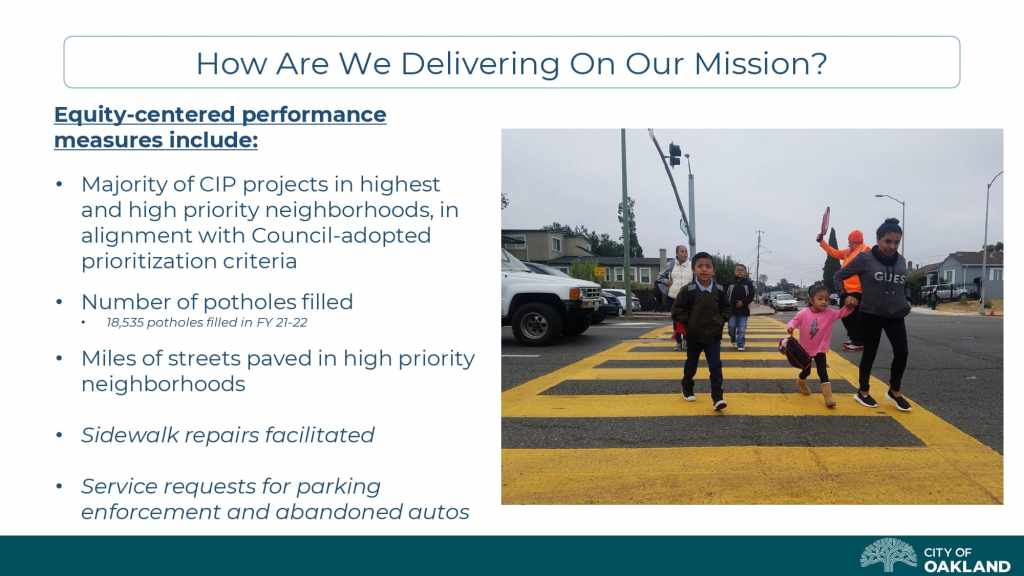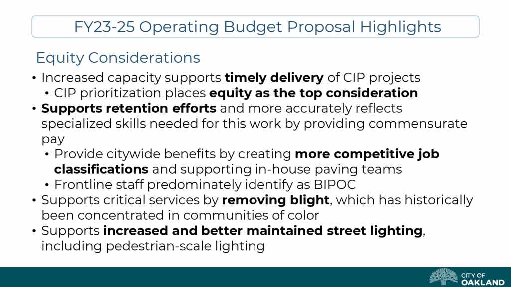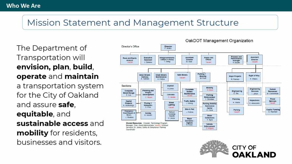 At the June 15, 2023 BPAC meeting, Fred Kelley, OakDOT Director, Megan Wier, OakDOT Assistant Director, Craig Raphael, OakDOT Senior Transportation Planner, and Tony Dang, OakDOT Policy & Intergovernmental Affairs Senior Advisor, will provide an update on the Fiscal Year 23-25 budget process that is underway, including updates on department leadership, the vacancy rate, organizational challenges, and recent accomplishments.