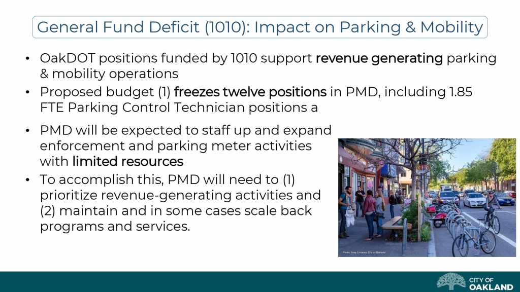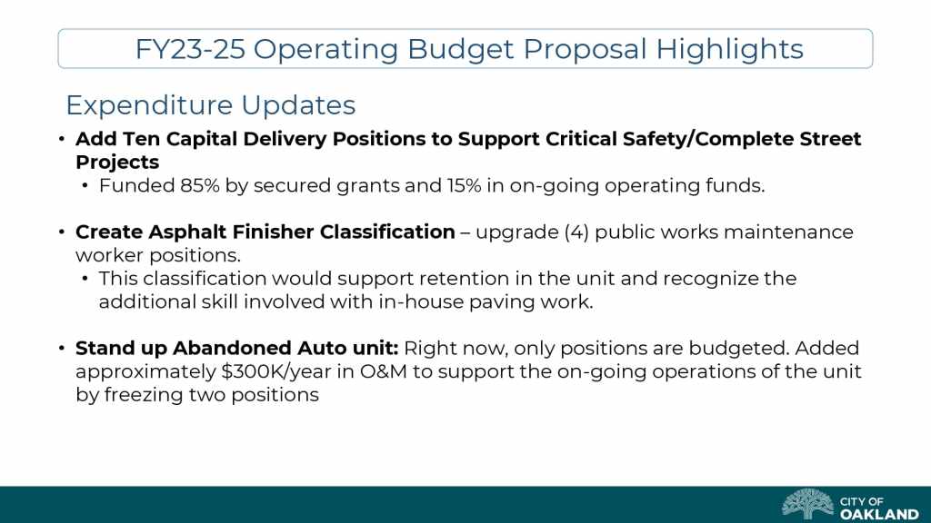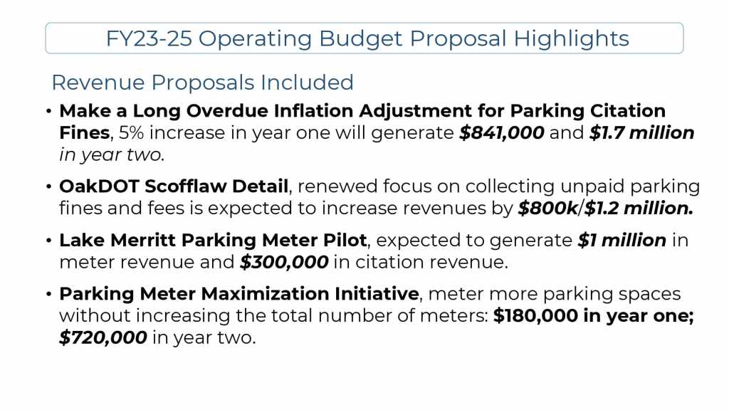 - OakDOT Scofflaw Detail, renewed focus on collecting unpaid parking fines and fees is expected to increase revenues by $800k/$1.2 million.