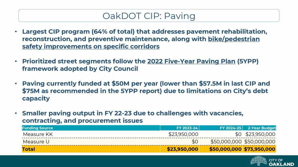 - Paving currently funded at $50M per year (lower than $57.5M in last CIP and $75M as recommended in the 5YPP report) due to limitations on City’s debt capacity