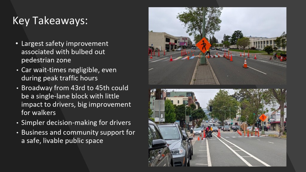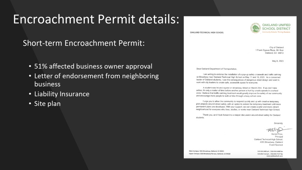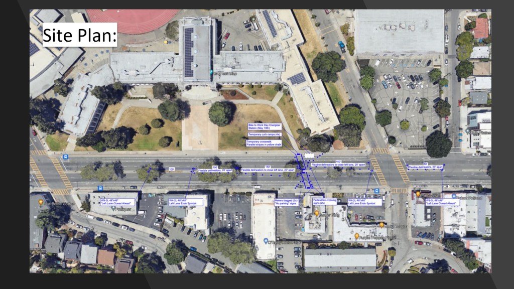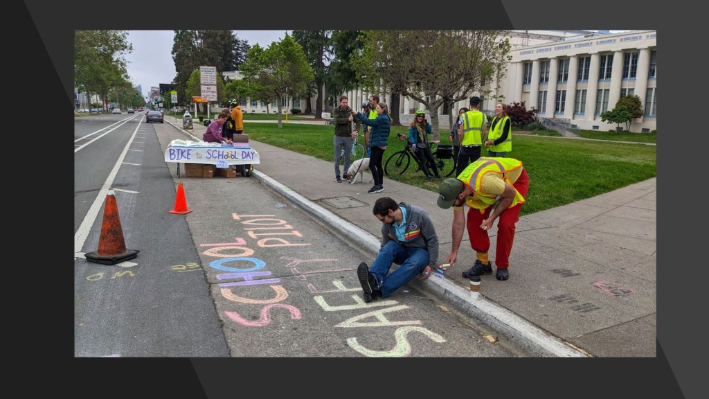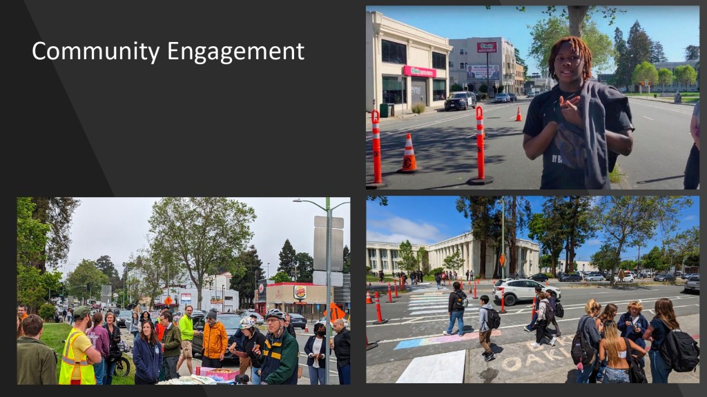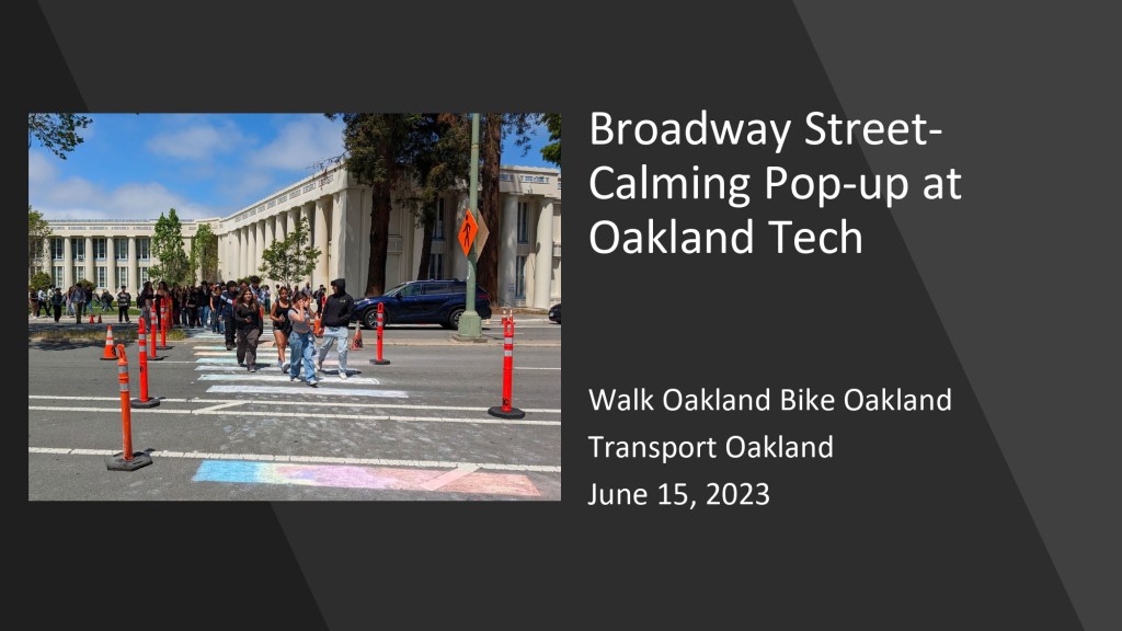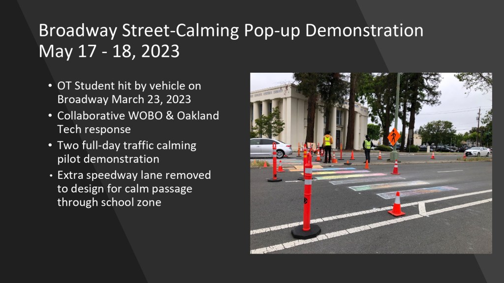 At the June 15, 2023 BPAC meeting, Walk Oakland Bike Oakland‘s Board President, Chris Hwang, shared highlights from Bike To Work Day celebrations from May 18, 2023. Natalie Mall, a volunteer who coordinated the project with Oakland Tech High School and Traffic Violence Rapid Response group, also shared highlights from the pop-up traffic safety demo on Broadway, implemented over two days, May 17-18.