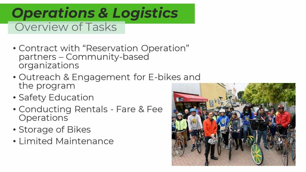 At the August 17, 2023 BPAC meeting, OakDOT Transportation Planner Michael Randolph provided an update on the Oakland Electric Bike Lending Pilot Program. This project will provide communities with access to affordable medium- and long-term rentals with approximately 136 e-bikes, cargo bikes, and adaptive bikes at launch, while supporting community-run bike shops to perform maintenance and educate users. This five-year project is funded by a $1,000,000 grant from the Clean Mobility Options Voucher (CMO) program. Staff has also applied for an additional $500,000 from the CMO Voucher program, to help support operations of the program.