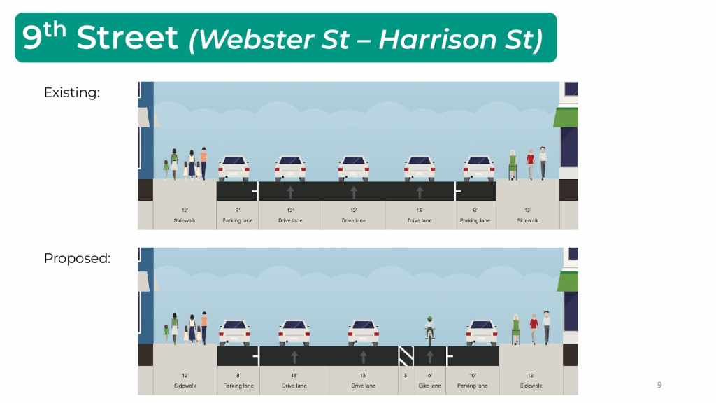 - 9th St, Webster to Harrison — does not meet 2019 bike plan recommendation for protected bikeway