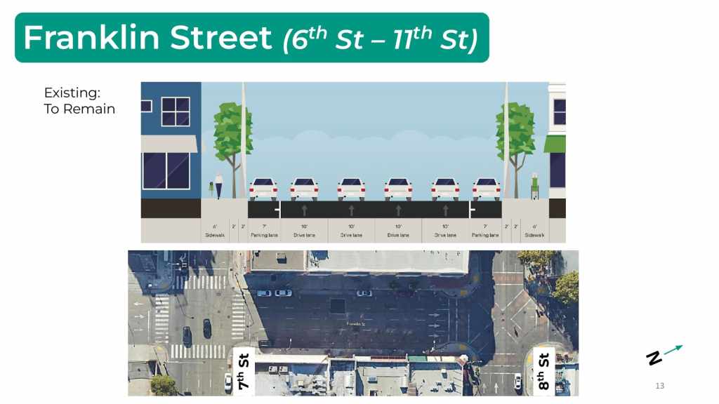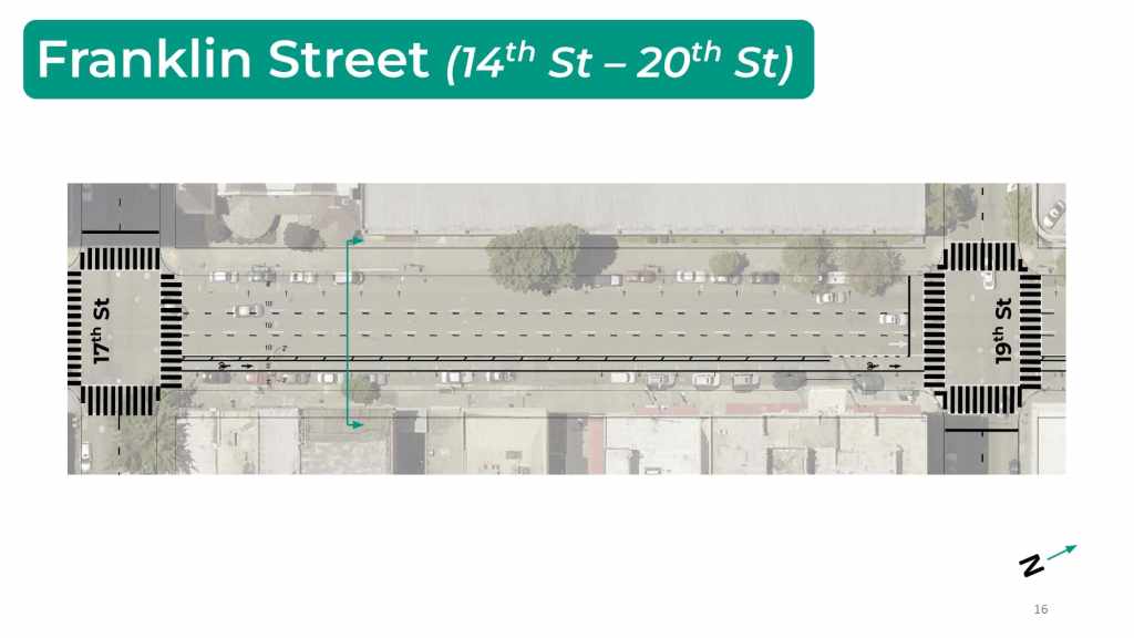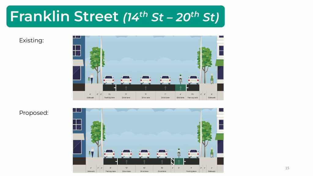 - Franklin St, 6th to 20th — will not meet 2019 bike plan recommendation, but the follow-up cycletrack project would.