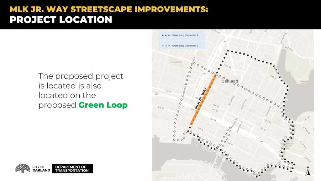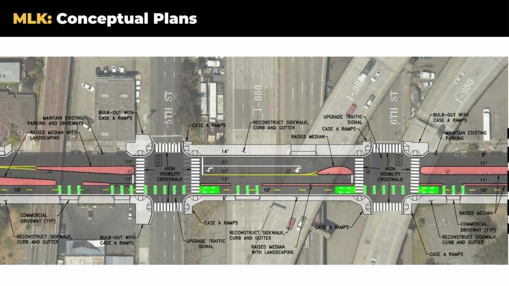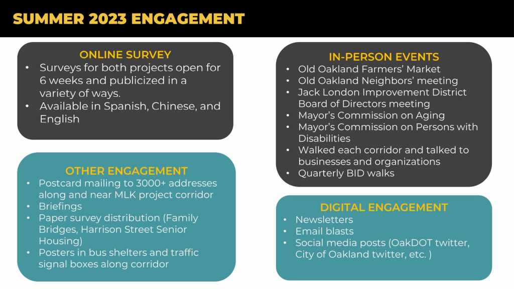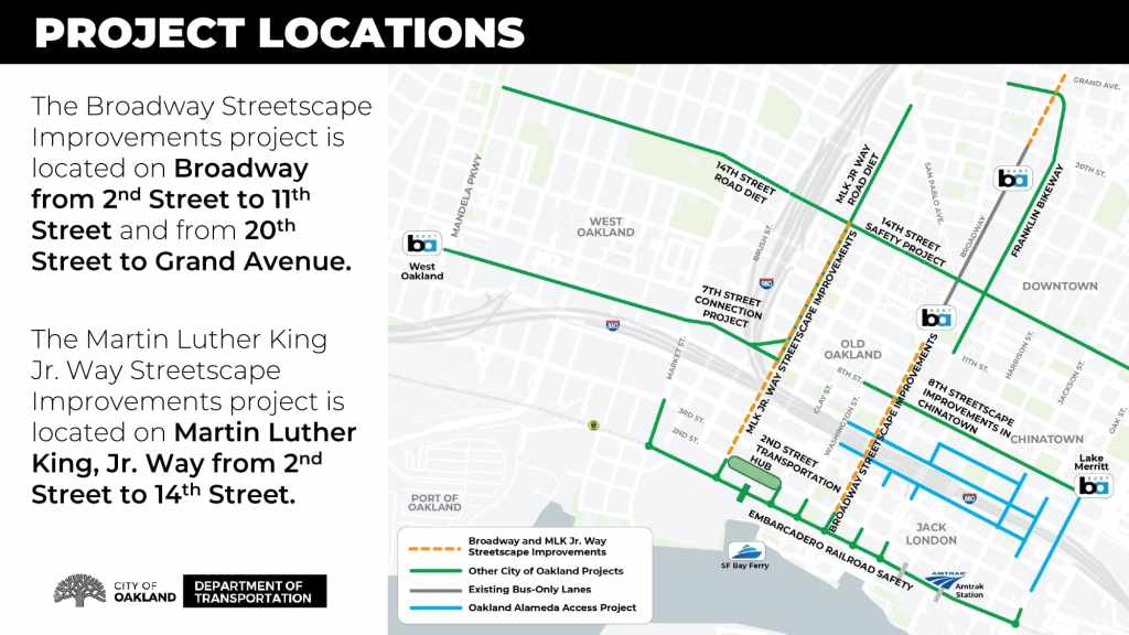 At the September 7, 2023 BPAC Infrastructure Committee meeting, OakDOT Transportation Engineer Beaver Boonsook and Transportation Planner Ruth Meza from the Major Projects Division provided an update on the Broadway Streetscape Improvements and the MLK Jr. Way Streetscape Improvements. The presentation included a summary of engagement, what was heard, and the current designs of the projects.
