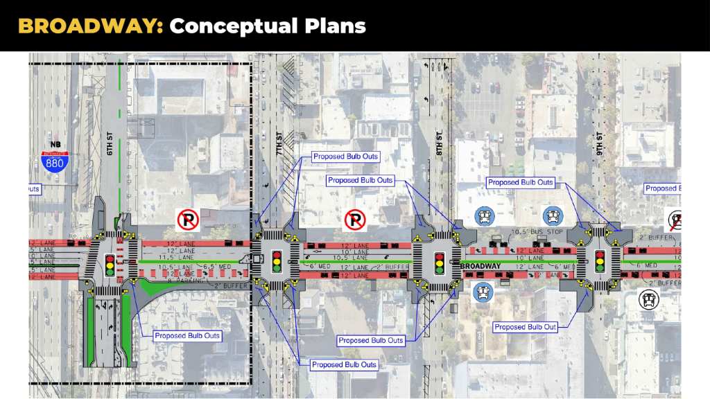 - Is data available on time savings benefit for buses for Broadway south of 880 where there are fewer buses? Concerns about potential bus lane abuse by drivers & safety impacts if there isn’t enough bus service provided