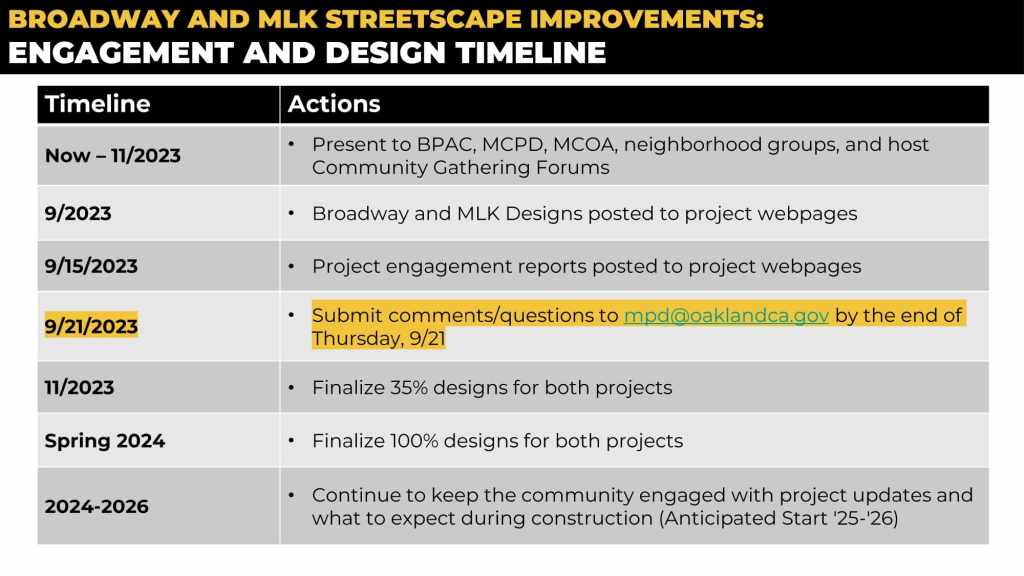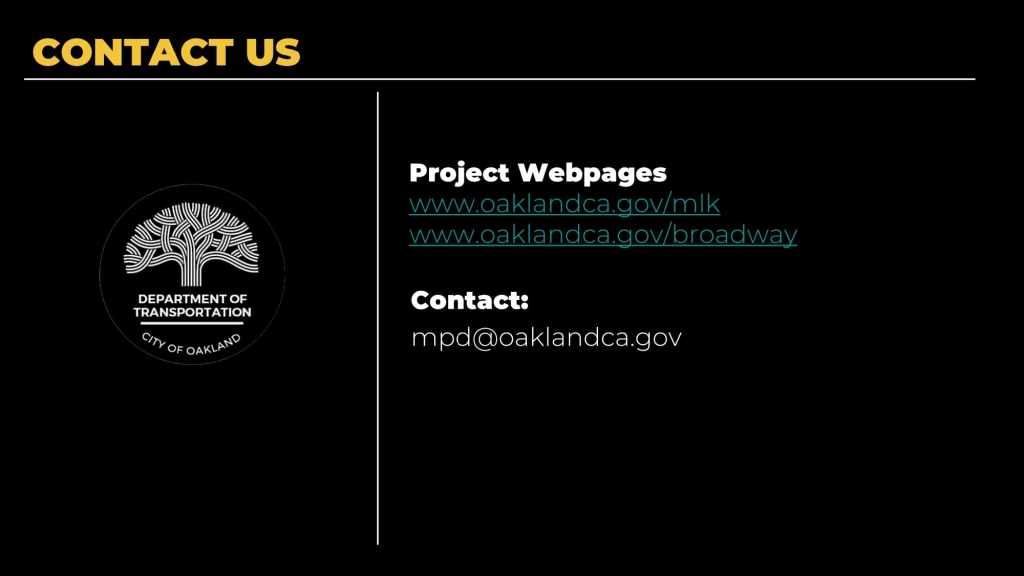 - Please submit any additional comments/questions to mpd@oaklandca.gov until the end of day on Thursday, 09/21/23, and reference Broadway or MLK in the subject line as applicable.