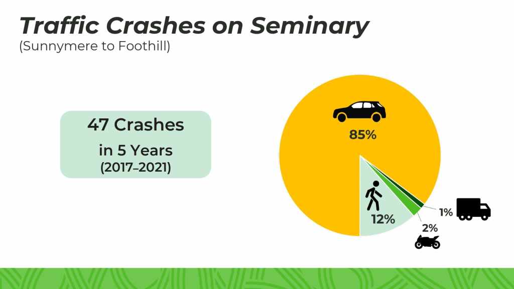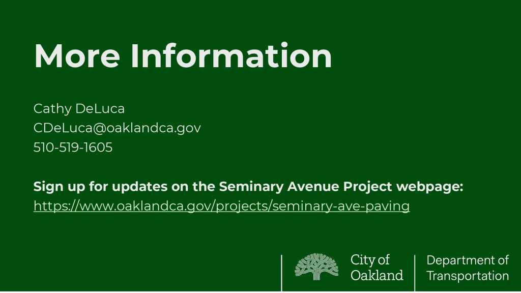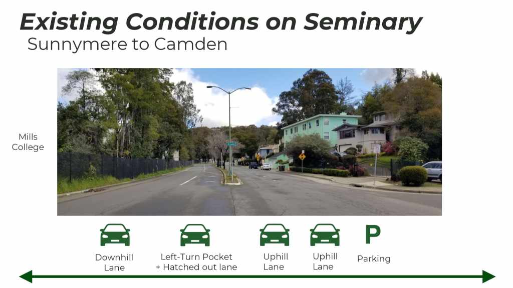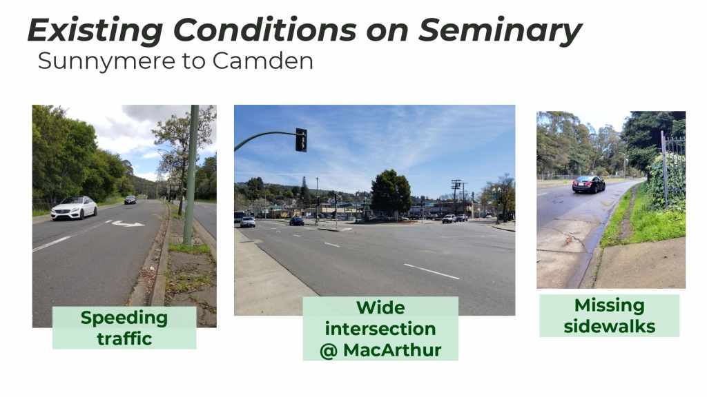 At the September 21, 2023 BPAC meeting, Colin Piethe and Cathy DeLuca, transportation planners from OakDOT’s Planning & Project Development team, provided an introduction to a paving project on Seminary Avenue between Sunnymere Boulevard and Foothill Boulevard. Staff is seeking commissioners’ feedback on initial conceptual designs, including a potential new bikeway between Sunnymere Boulevard and MacArthur Boulevard.