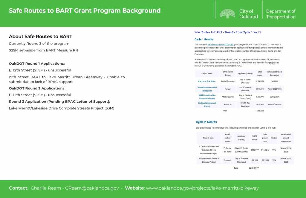 At the October 19, 2023 BPAC meeting, Craig Raphael, Senior Transportation Planner with OakDOT’s Capital Finance team, provided an overview of and requested a BPAC letter of support for an upcoming application to the Safe Routes to BART construction grant program for a cycle track at Lakeside Drive between International Boulevard and 19th Street.