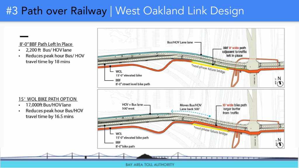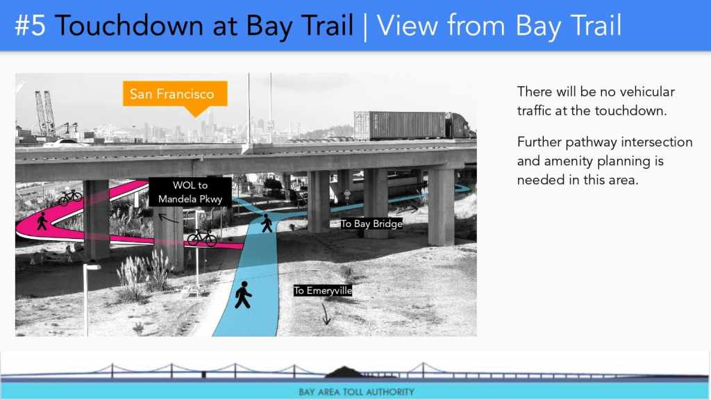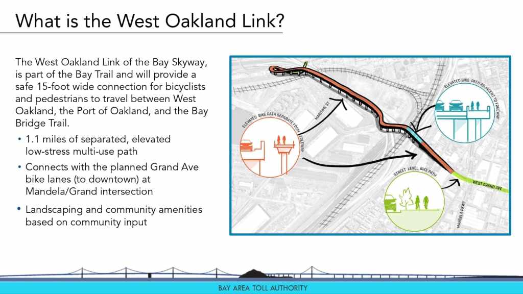 “The West Oakland Link of the Bay Skyway, is part of the Bay Trail and will provide a safe 15-foot wide connection for bicyclists and pedestrians to travel between West Oakland, the Port of Oakland, and the Bay Bridge Trail.
