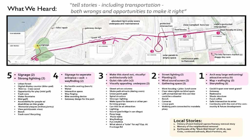 - Like the roundabout idea between the West Oakland and Emeryville paths. Opportunity for art to help with placemaking as well as wayfinding.