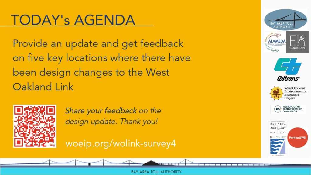 Today’s agenda: Provide an update and get feedback on five key locations where there have been design changes to the West Oakland Link.”