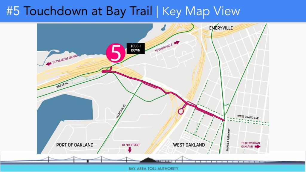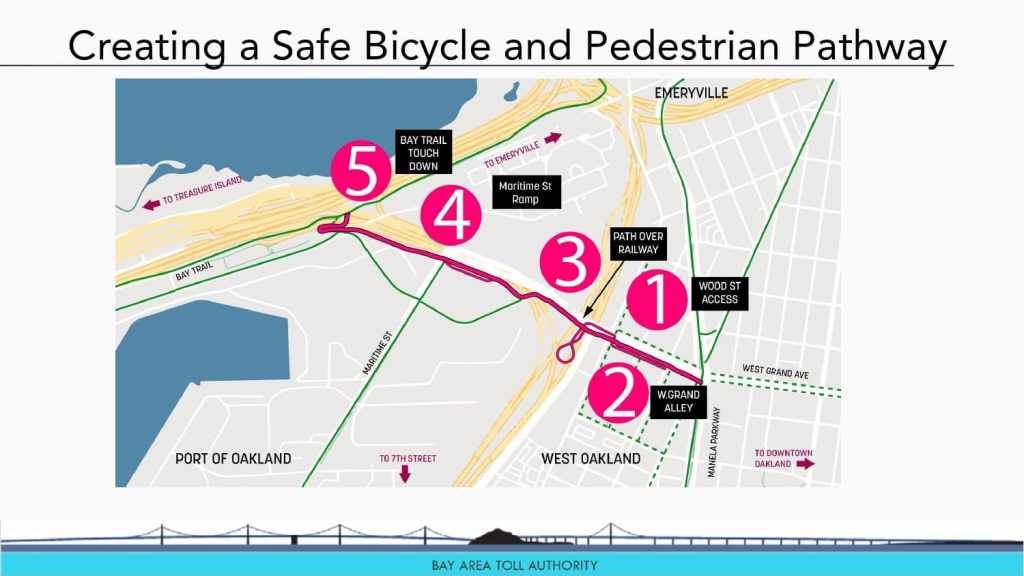 - Phase 1 is the West Oakland to Treasure Island connection. Eventual plan is to connect a bike/walk pathway fully to San Francisco.