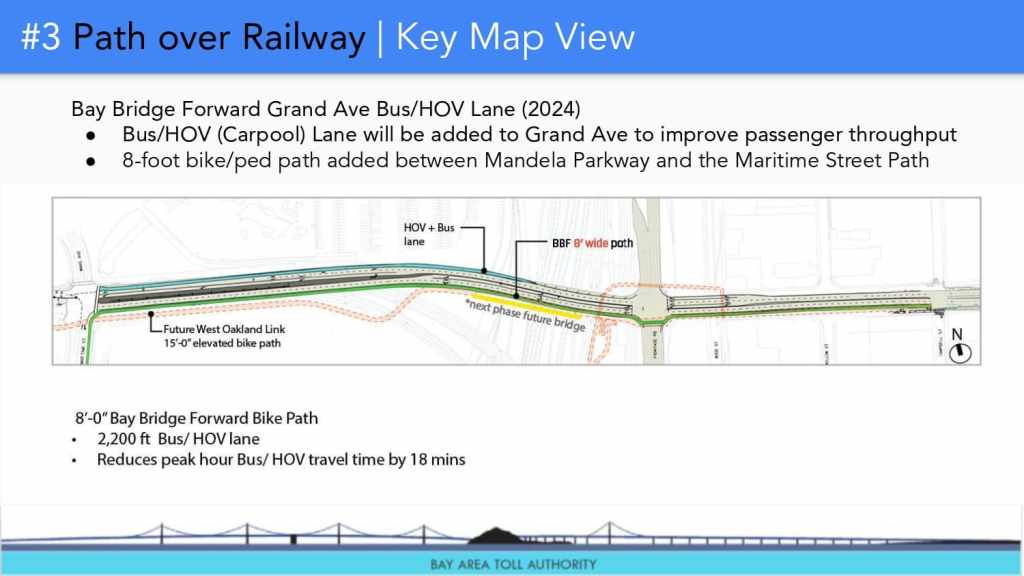 - Near term project to be delivered in 2024 includes bus lane connections on West Grand Ave to the Bay Bridge, also an 8-foot bike/walk path on the south side of West Grand from Mandela to Maritime.