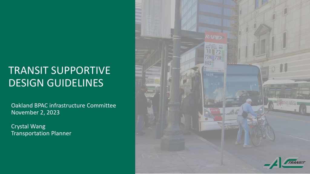 At the November 2, 2023 BPAC Infrastructure Committee meeting, AC Transit Transportation Planner Crystal Wang provided an introductory overview of their Transit Supportive Design Guidelines, an update to the agency’s current Multimodal Corridor Guidelines [PDF].