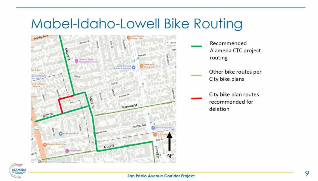 - Alameda CTC project won’t deliver this segment, but the city can potentially follow up on their own. This Alameda CTC project will not modify the Oakland Bike Plan recommendation for the Herzog/66th bikeway, this would be a separate city-led planning process.