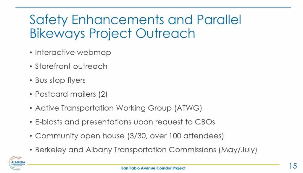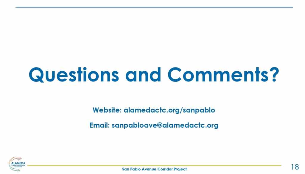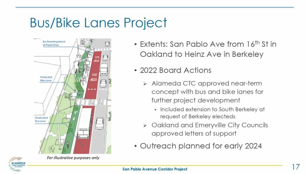 The Alameda County Transportation Commission (ACTC) is working in collaboration with the City of Oakland on the development of a program of San Pablo Avenue corridor projects. At the November 2, 2023 BPAC Infrastructure Committee meeting, Matt Bomberg, Senior Transportation Engineer and Colin Dentel-Post, Principal Transportation Planner presented the San Pablo Avenue Parallel Bike Improvements Project which includes neighborhood bikeway treatments along local streets parallel to San Pablo Avenue in North Oakland, Berkeley, and Albany.