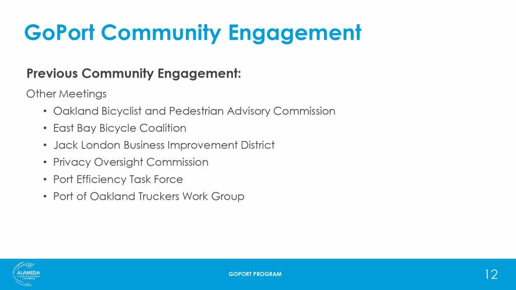 At the January 11, 2024 BPAC Infrastructure Committee meeting, Port of Oakland Senior Maritime Projects Administrator Pia Franzese will provide a presentation on how the construction of the 7th Street Grade Separation East project (7SGSE) (Bay Street to Maritime Street) will affect access to the Bay Trail during construction, and an update on other improvements proposed along 7th Street.