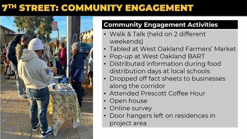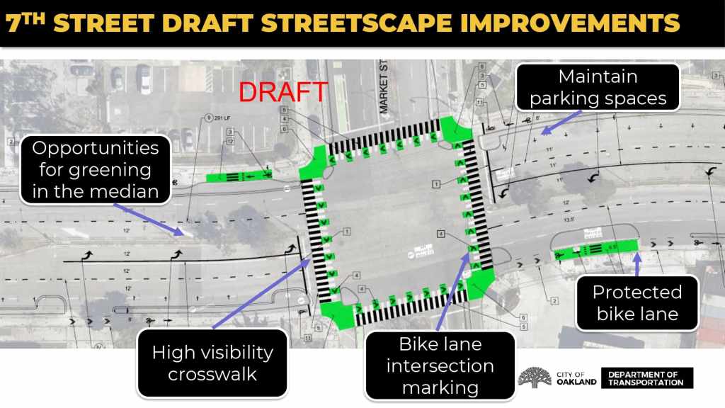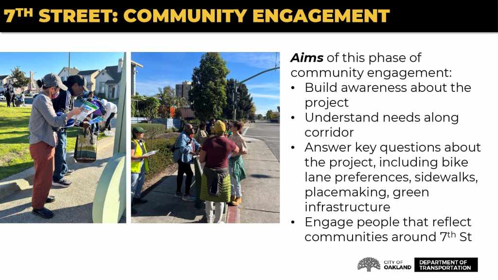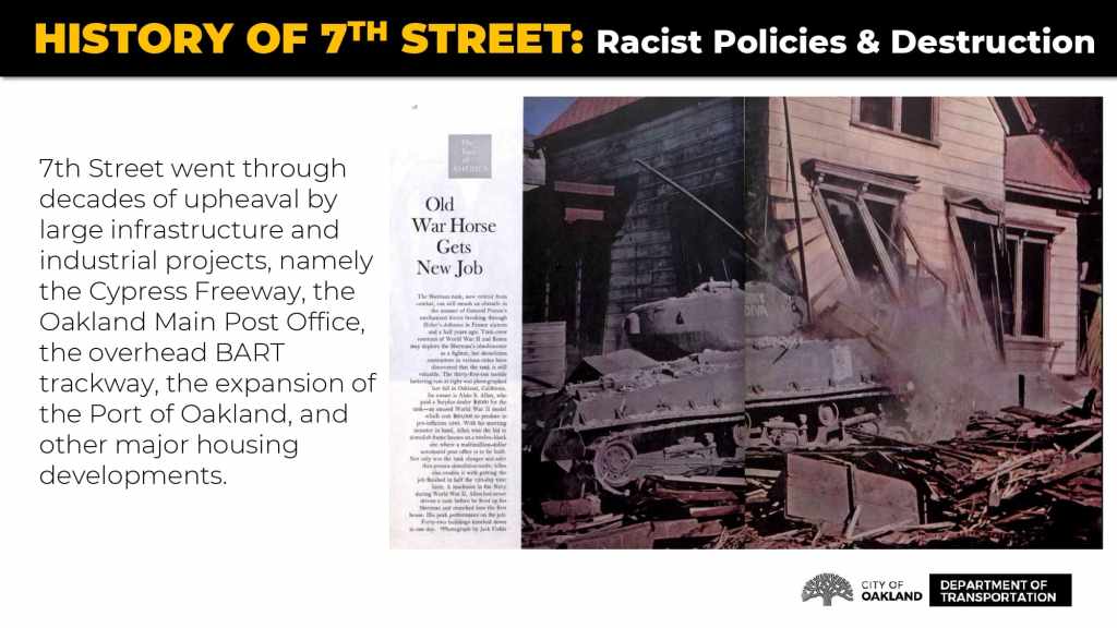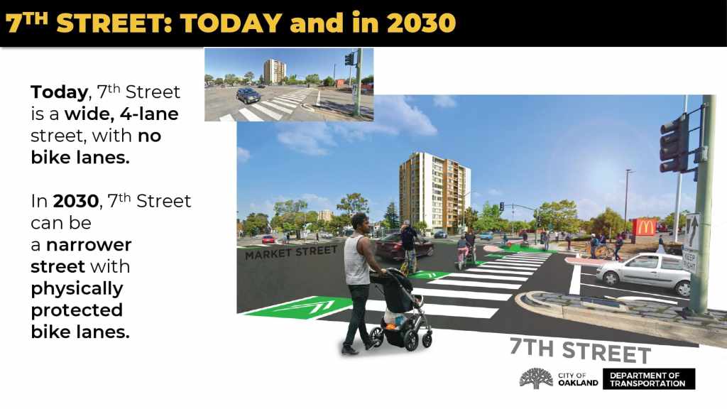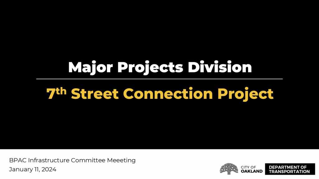 At the January 11, 2024 BPAC Infrastructure Committee meeting, the City of Oakland’s DOT (OakDOT) Major Projects Division will provide an update and accept input on the 7th Street Connection Project from Mandela Parkway to MLK Jr Way in West Oakland. The project aims to reconnect West Oakland and Downtown, create safer and more comfortable ways to travel for those walking, rolling, and taking the bus, improve air quality, and reflect the rich history of 7th Street.