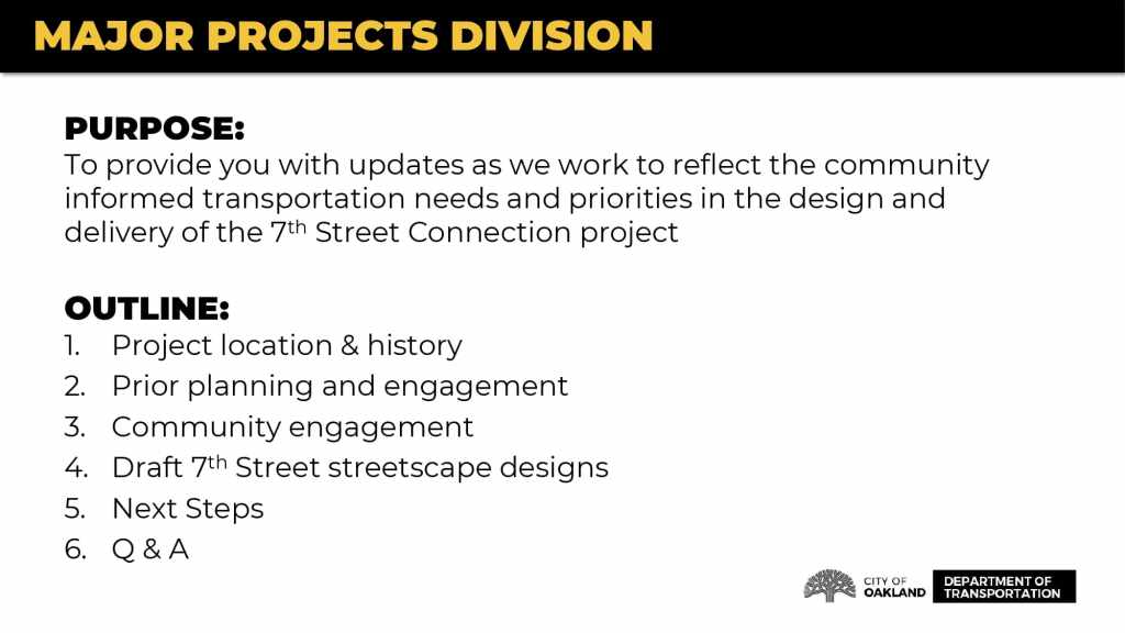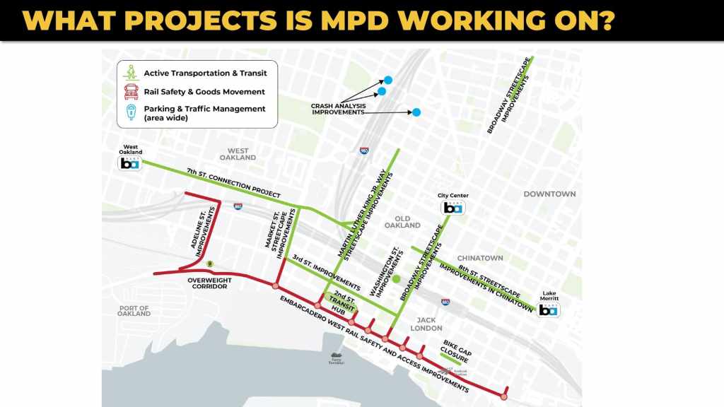 - Oakland DOT’s major projects division is working on this project. Overall goal of enhancing connections between West Oakland, Jack London Square, Downtown, and Chinatown.