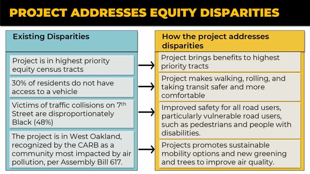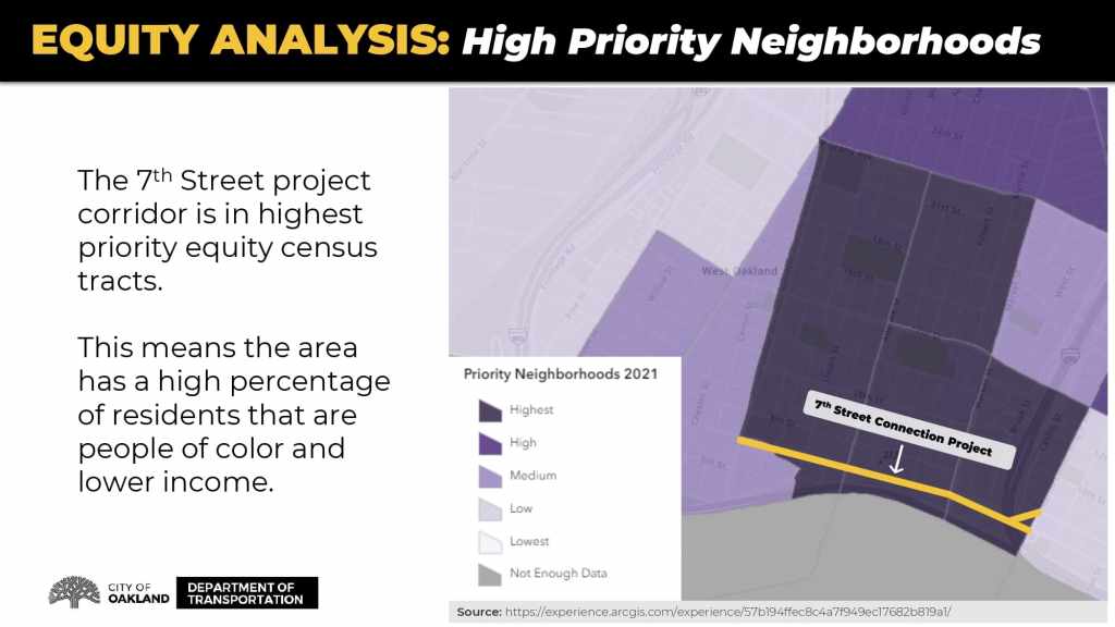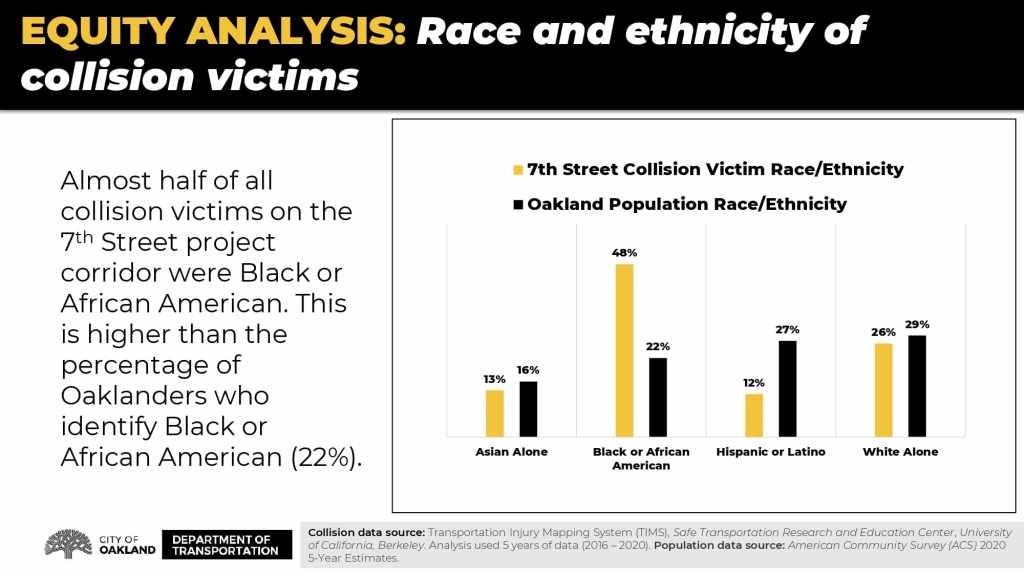 - Oakland DOT conducted an equity analysis to better understand who will be impacted by the project, and looked who has been most impacted by crashes based on data analysis—this area indicated as highest equity priority category, and Black Oaklanders are most impacted by crashes in the area.
