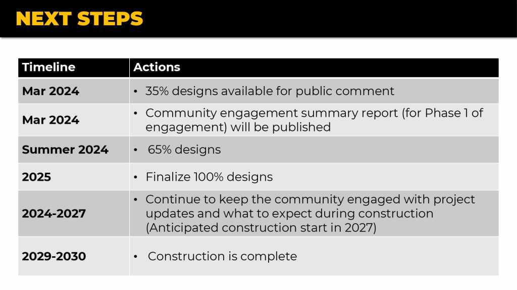 - Hope to complete design by June 2025, construction start in 2027 to be completed by 2030.