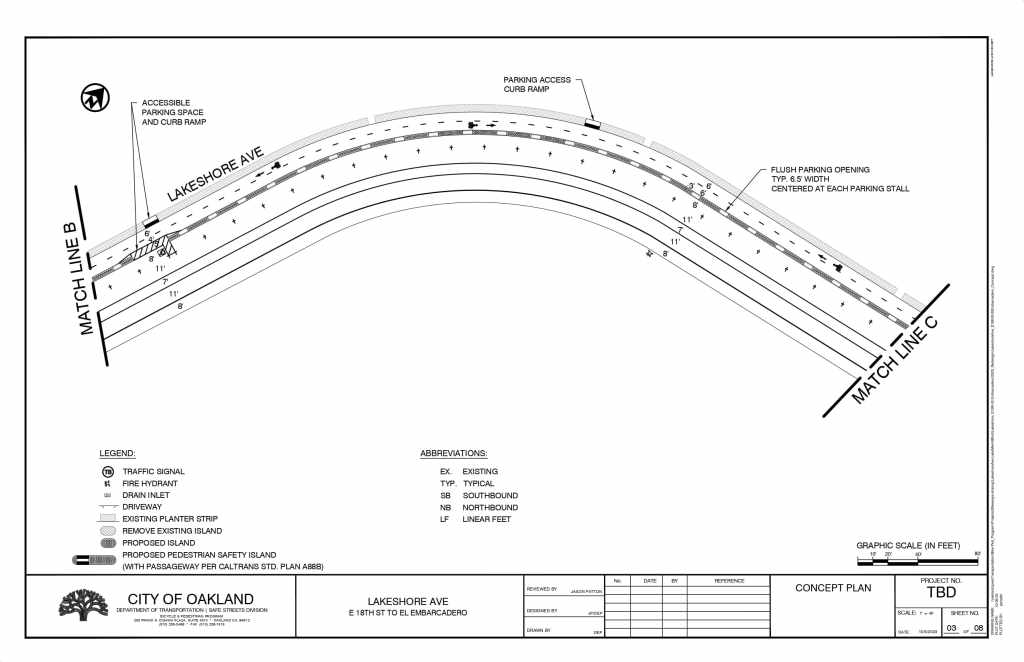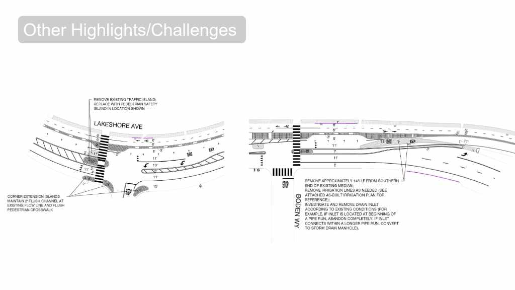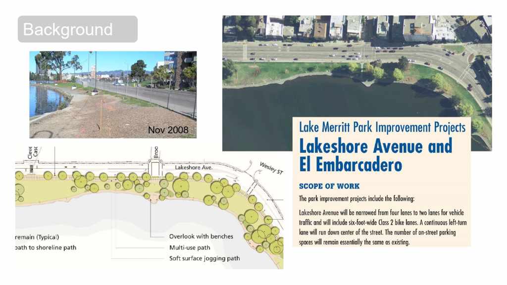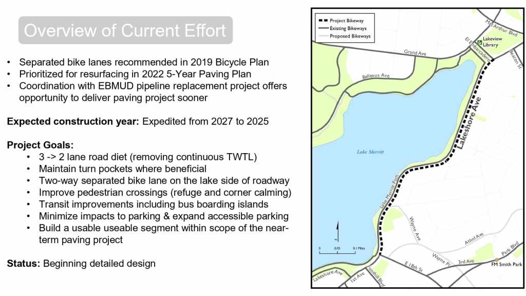 At the March 7, 2024 BPAC Infrastructure Committee meeting, OakDOT staff in the Safe Streets Division, Bicycle and Pedestrian Program will provide an introduction to the Lakeshore Ave Separated Bike Lanes Project. After a brief background, the presentation and discussion will focus on the concept plans for the proposed two-way cycle track on Lakeshore Avenue from East 18th Street to El Embarcadero.
