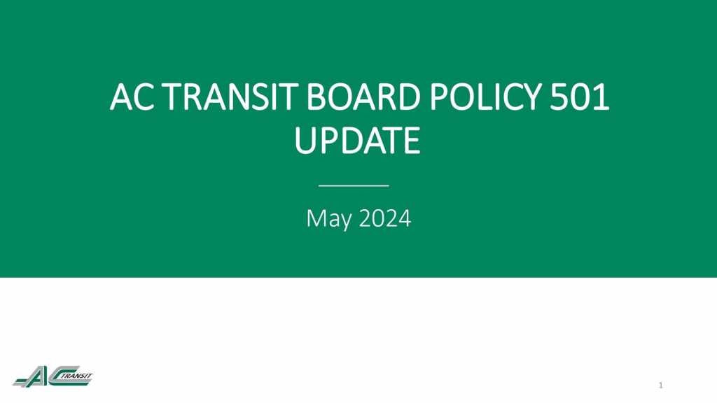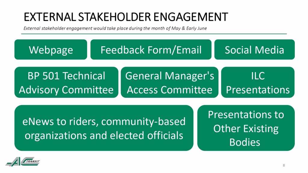 At the May 2, 2024 BPAC Infrastructure Committee meeting, AC Transit will present an update of AC Transit Board Policy 501.