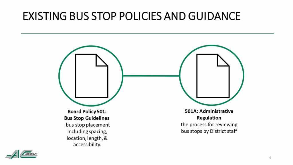 AC Transit Board Policy No. 501: Bus Stop Guidelines, sets forth AC Transit’s guidelines for future bus stop placement regarding spacing, location, and accessibility. The policy is due for its five-year update to clarify bus stop policy elements aligning with the needs and preferences of AC Transit riders and to reflect the latest in best practices and customer needs. Specifically, the goals of this update include making the policy more customer-focused, addressing safety concerns that affect bus stop placement, and ensuring rider access to the District’s service network.