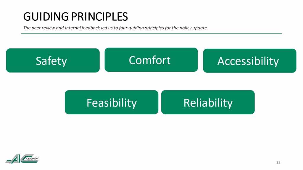 - Developed AC Transit guide : safety, comfort, accessibility, feasibility, reliability