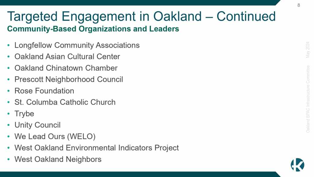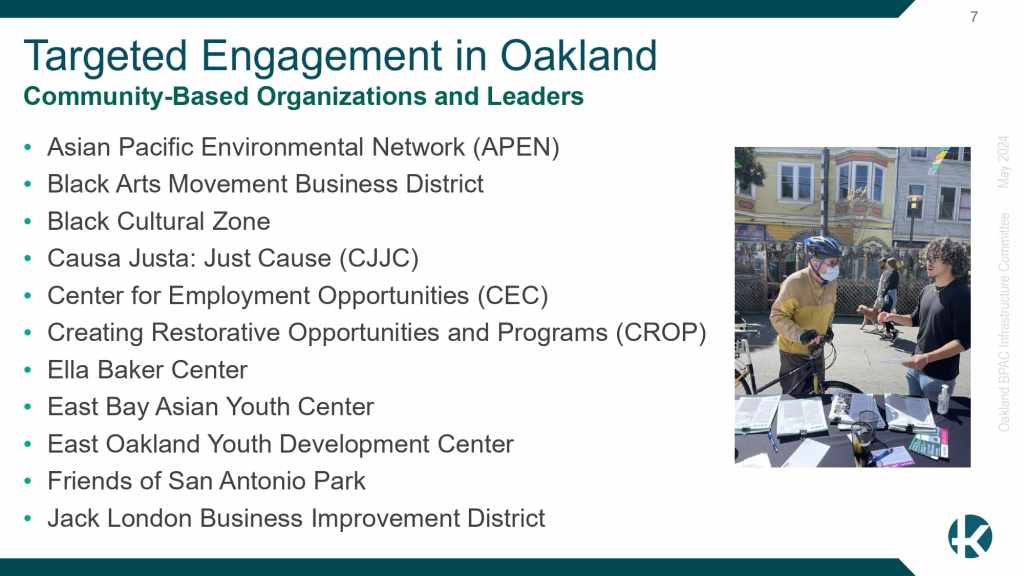 - Equity commitment: seeking to elevate equity in planning process—established an equity advisory council (including 4 members from Oakland).