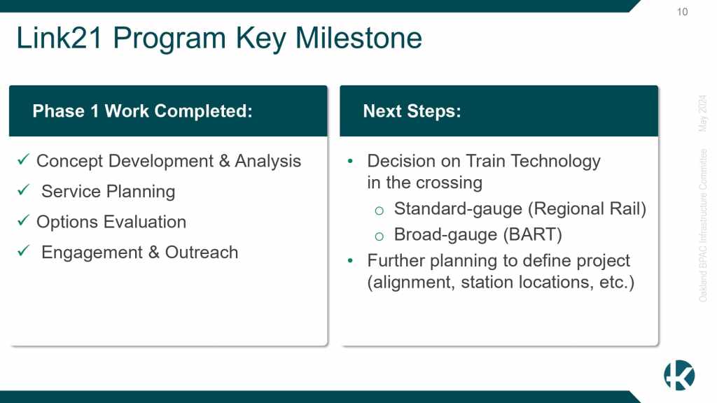 - Reaching decision point: Either a standard gauge crossing connected with the regional rail network (such as Caltrain and Capitol Corridor); or a broad gauge connection to the BART network.
