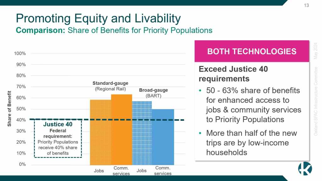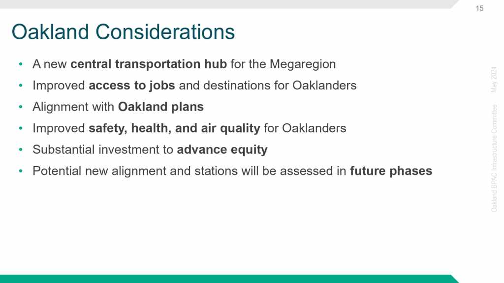 - Benefits for Oakland: potential one seat rides between Oakland and the Peninsula, Emeryville, West Berkeley; faster and better connected rails service to Sacramento, Stockton, I-80 corridor; new rail transfer hub in Downtown Oakland; new alignment would be underground through Oakland.