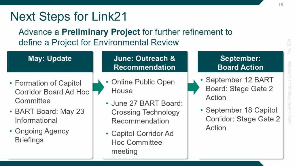 At the May 2, 2024 BPAC Infrastructure Committee meeting, Brian Soland and Darin Ranelletti from BART’s Planning and Development team will present an informational update on the Link21 project.