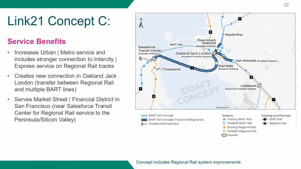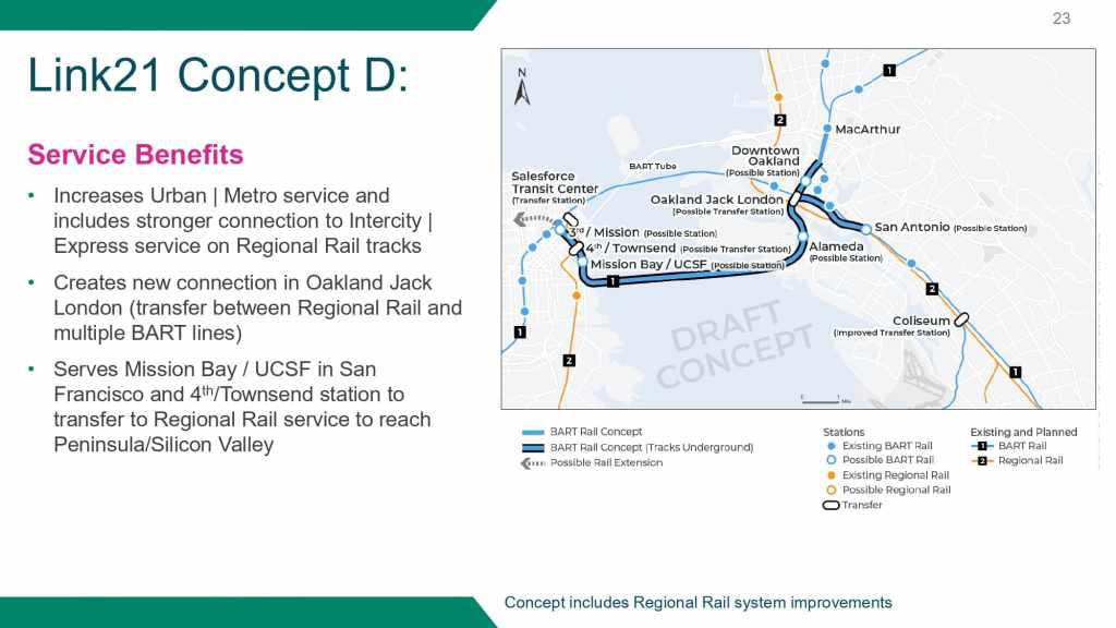 - Goal of providing more service, more destinations, new underground connection SF to East bay with connections to rail.