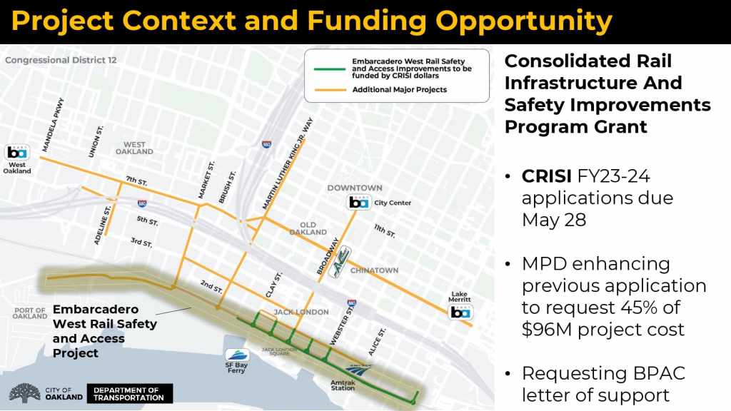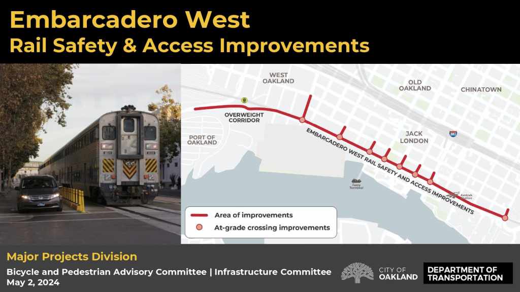 At the May 2, 2024 BPAC Infrastructure Committee meeting, Acacia Dupierre, Senior Transportation Planner of OakDOT’s Major Projects Division, will present on the Embarcadero West Rail Safety and Access Improvements project. The project will significantly increase multi-modal safety and accessibility along the Embarcadero West corridor and surrounding neighborhoods while reducing delays for freight and passenger rail.