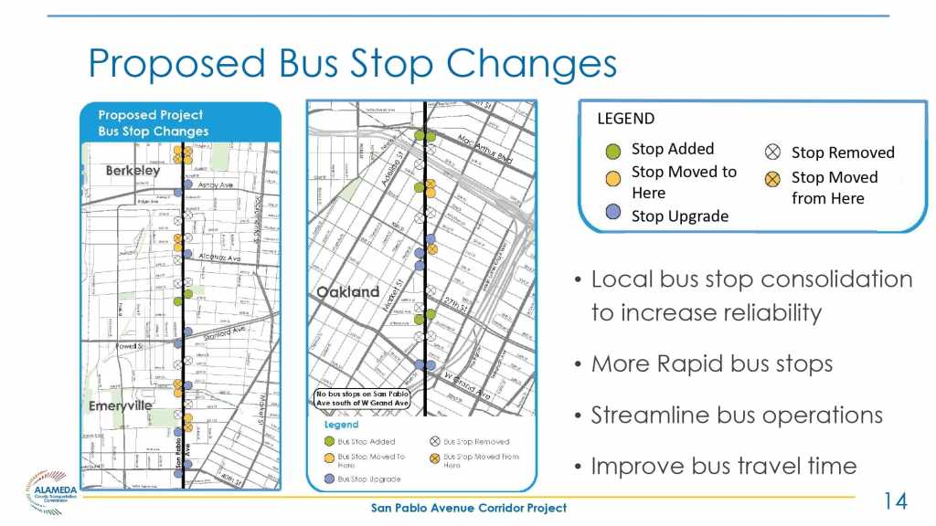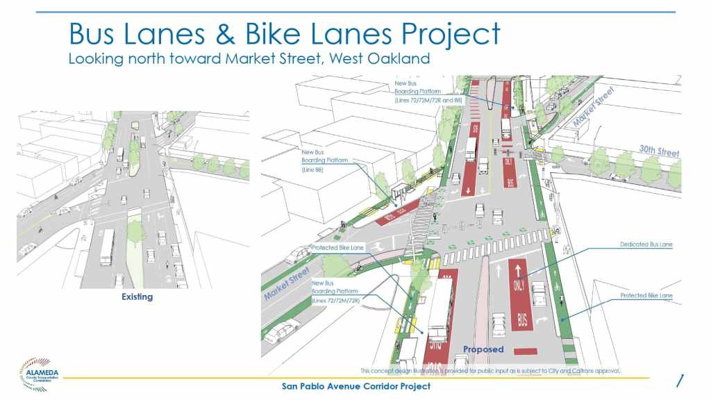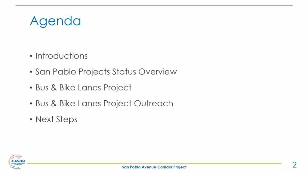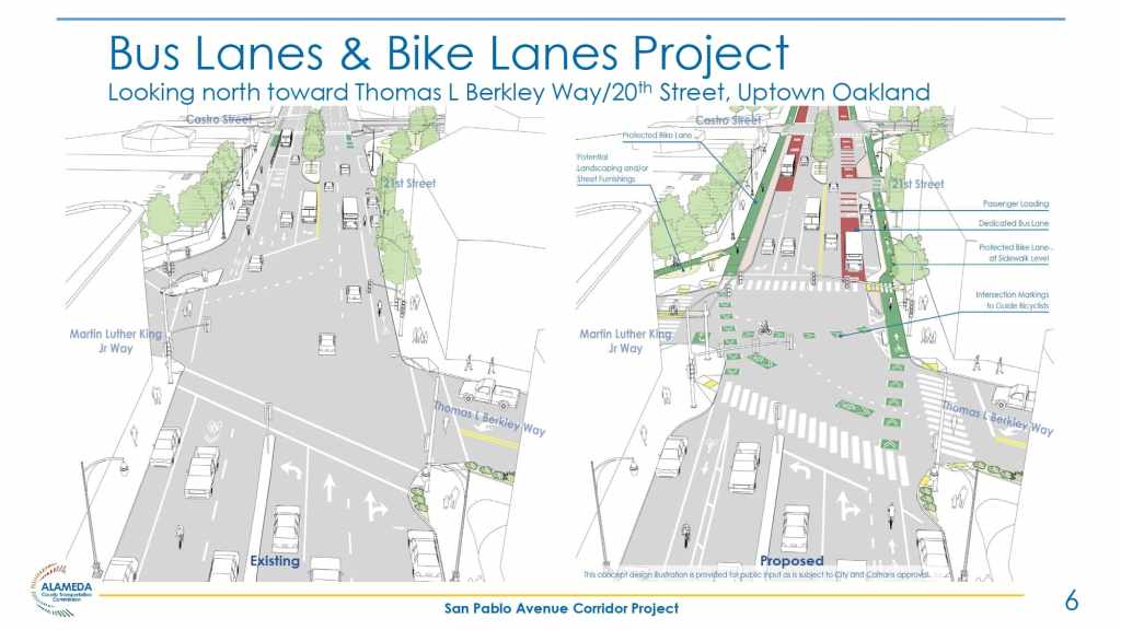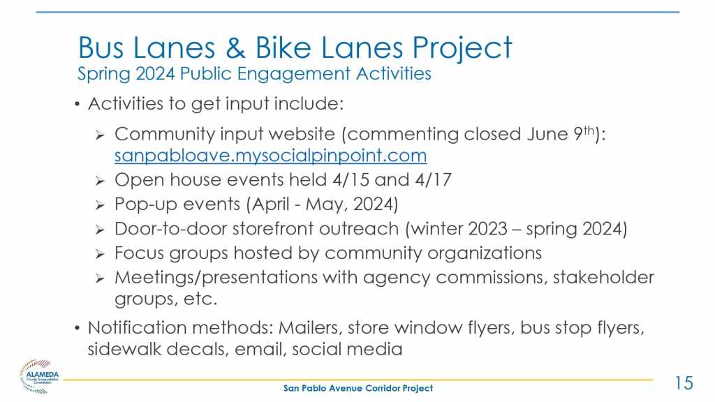 At the June 20, 2024 BPAC meeting, Aleida Andrino-Chavez and Colin Dentel-Post, from the Alameda County Transportation Commission (ACTC) will present on the San Pablo Avenue Bus and Bike Lanes Project. The Project would create dedicated bus lanes, new curb-protected bike lanes, and safer street crossings for people walking and biking along San Pablo Avenue between Heinz Avenue in South Berkeley and Downtown Oakland. Alameda CTC is currently conducting public outreach to gather feedback on the proposed project and your feedback is highly appreciated.