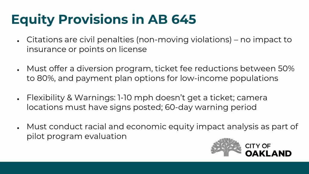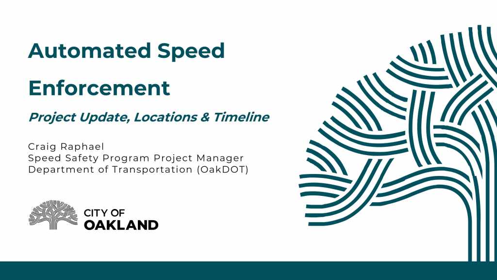 At the July 18, 2024 BPAC meeting, Craig Raphael, Speed Safety Camera Program Manager at OakDOT, will present an update on implementation of speed safety cameras under Assembly Bill 645, which authorized a five-year speed camera pilot in six California cities.