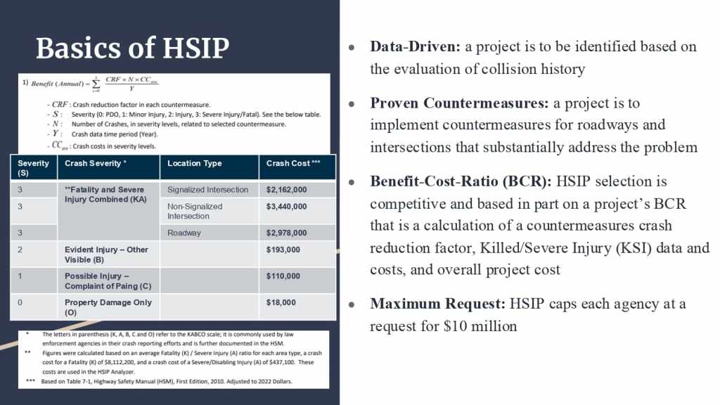 - Benefit-Cost-Ratio (BCR): HSIP selection is competitive and based in part on a project’s BCR that is a calculation of a countermeasures crash reduction factor, KSI data and costs, and overall project cost.